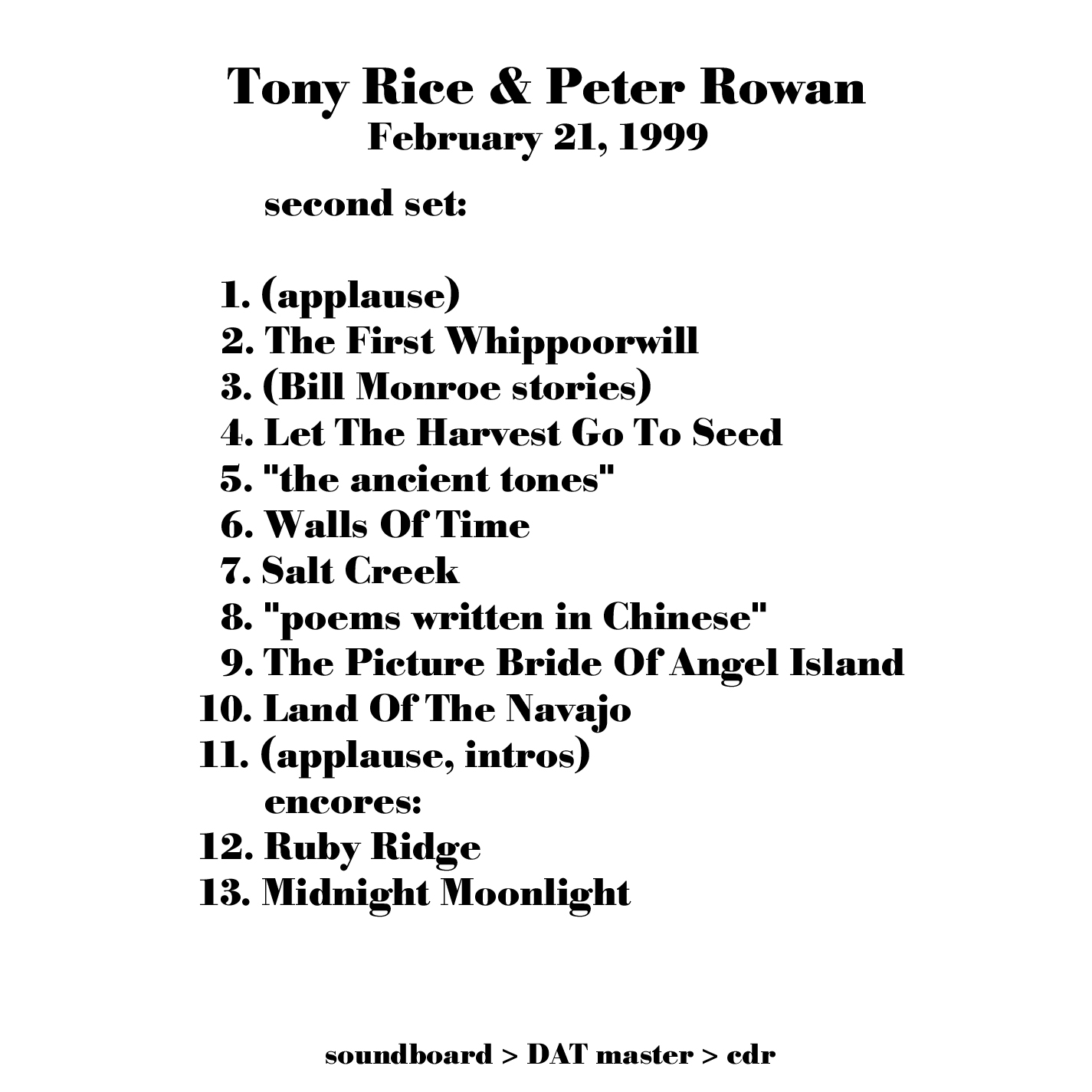 Comments : soundboard > DAT master > optical digital > Zefiro ZA2 > Sound Forge > CD Architect > Philips OMNIwriter26 1.20 > cdr > EAC > .shn