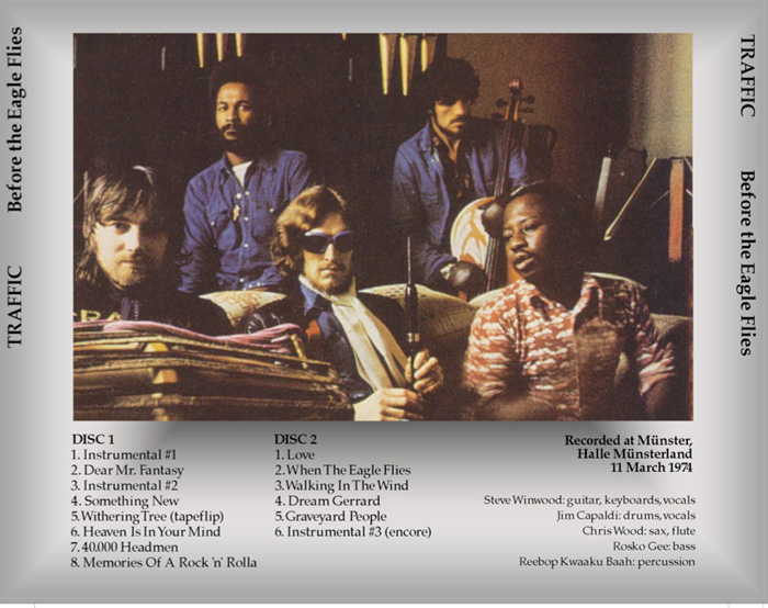 To continue the run of 1974 shows from Traffic, here's a fairly good audience recording that was originally posted on Bootcity. Unlike other recordings out there from this era that feature the group's final four-piece lineup, at this German show Reebop was still with the band, making them five. The performance is a good one. There are three instrumentals never officially released (including Chris Wood's "Vulcan"), an extended, nearly avant garde intro to "Graveyard People", plus the rarely performed "Withering Tree", which, alas, is marred by a tape flip. In fact, there were a number of tape flips on this that I tried to smooth out as much as I could -- "Love" and "Graveyard People" both came in two pieces, and I've crossfaded each pair of them together. I also created artwork.